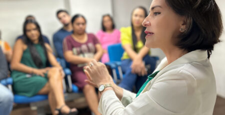 #PraTodoMundoVer: VĂdeo da vereadora EmĂlia CorrĂȘa, ao lago do jornalista SĂ©rgio Cursino, durante o quadro âSeu Direitoâ, na @tvatalaia . EmĂlia que estĂĄ de cabelo solto, segurando o microfone (gesticulando) ao responder os questionamentos, veste uma blusa com mangas largas na cor verde, uma calça preto e um sapato vinho fechado.